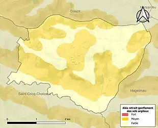 Le retrait-gonflement des sols argileux est susceptible d'engendrer des dommages importants aux bâtiments en cas d’alternance de périodes de sécheresse et de pluie. 59,4 % de la superficie communale est en aléa moyen ou fort (19,2 % au niveau départemental et 48,5 % au niveau national). Sur les 89 bâtiments dénombrés sur la commune en 2019, 55 sont en aléa moyen ou fort, soit 62 %, à comparer aux 17 % au niveau départemental et 54 % au niveau national. Une cartographie de l'exposition du territoire national au retrait gonflement des sols argileux est disponible sur le site du BRGM[19],[Carte 2].