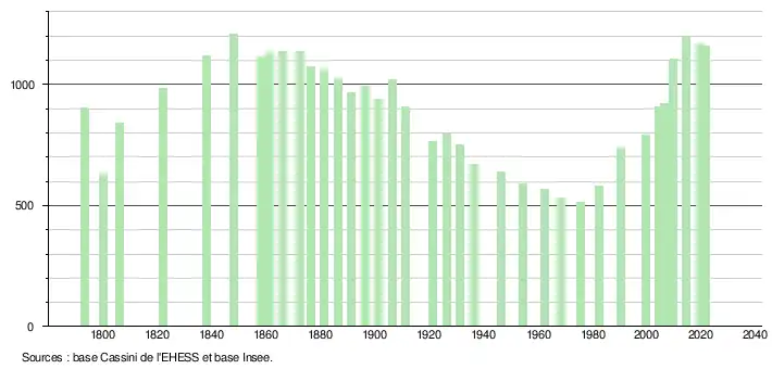L'évolution du nombre d'habitants est connue à travers les recensements de la population effectués dans la commune depuis 1793. Pour les communes de moins de 10 000 habitants, une enquête de recensement portant sur toute la population est réalisée tous les cinq ans, les populations légales des années intermédiaires étant quant à elles estimées par interpolation ou extrapolation[11]. Pour la commune, le premier recensement exhaustif entrant dans le cadre du nouveau dispositif a été réalisé en 2004[12].