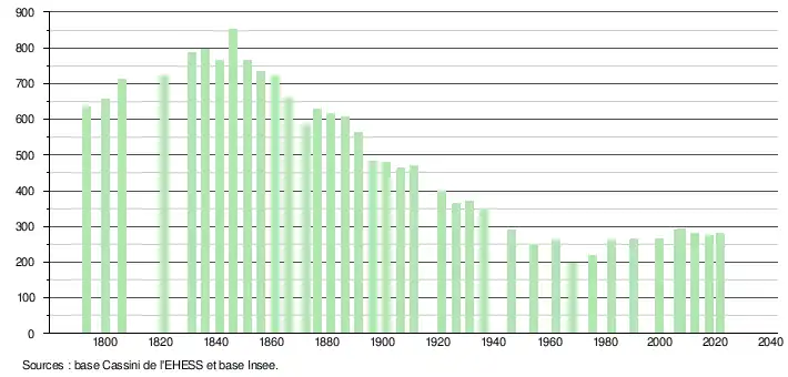 L'évolution du nombre d'habitants est connue à travers les recensements de la population effectués dans la commune depuis 1793. Pour les communes de moins de 10 000 habitants, une enquête de recensement portant sur toute la population est réalisée tous les cinq ans, les populations légales des années intermédiaires étant quant à elles estimées par interpolation ou extrapolation[15]. Pour la commune, le premier recensement exhaustif entrant dans le cadre du nouveau dispositif a été réalisé en 2007[16].