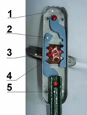 La manœuvre est assurée par un bouton (3), une béquille ou une boucle qui actionne un mécanisme protégé par une boîte (1). La tige du bouton est solidaire d'un disque pourvu de tenons ou d'un pignon à dents arrondies (4) qui font office de « cames » et agissent sur des crémaillères (2) taillées à l'extrémité des tringles. Le mouvement de rotation provoque un mouvement de translation rectiligne des tringles soit vers le haut, soit vers le bas.