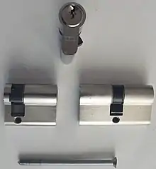 Le cylindre est percé de trous perpendiculaires au chemin de clé (généralement 5 ou 6), à l’intérieur desquels coulissent des pistons, qui sont positionnés selon la hauteur des crans de la clef. Ces trous correspondent à d’autres ouvertures percées dans le barillet, qui contiennent des goupilles pressées en direction du cylindre par des ressorts hélicoïdaux. Les chasse-goupilles ont chacun une taille différente définissant la combinaison de la serrure. Lorsqu’on introduit la clef dans la serrure, cette dernière repousse les chasse-goupilles qui à leur tour appuient sur les goupilles.