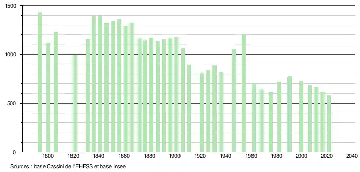 L'évolution du nombre d'habitants est connue à travers les recensements de la population effectués dans la commune depuis 1793. Pour les communes de moins de 10 000 habitants, une enquête de recensement portant sur toute la population est réalisée tous les cinq ans, les populations légales des années intermédiaires étant quant à elles estimées par interpolation ou extrapolation[23]. Pour la commune, le premier recensement exhaustif entrant dans le cadre du nouveau dispositif a été réalisé en 2006[24].