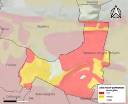 La commune est vulnérable au risque de mouvements de terrains constitué principalement du retrait-gonflement des sols argileux[20]. Cet aléa est susceptible d'engendrer des dommages importants aux bâtiments en cas d’alternance de périodes de sécheresse et de pluie. 86,4 % de la superficie communale est en aléa moyen ou fort (67,5 % au niveau départemental et 48,5 % au niveau national). Sur les 295 bâtiments dénombrés sur la commune en 2019, 294 sont en aléa moyen ou fort, soit 100 %, à comparer aux 90 % au niveau départemental et 54 % au niveau national. Une cartographie de l'exposition du territoire national au retrait gonflement des sols argileux est disponible sur le site du BRGM[21],[Carte 2].