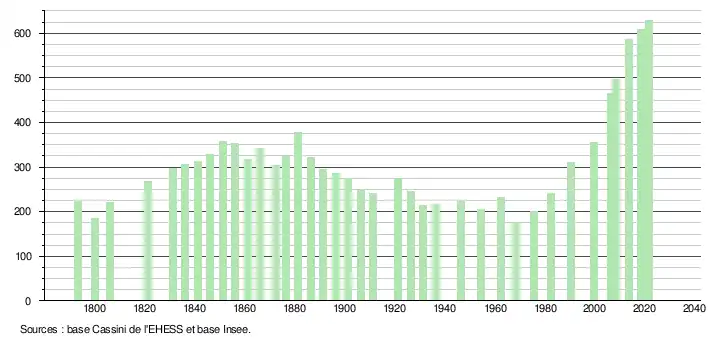 L'évolution du nombre d'habitants est connue à travers les recensements de la population effectués dans la commune depuis 1793. Pour les communes de moins de 10 000 habitants, une enquête de recensement portant sur toute la population est réalisée tous les cinq ans, les populations légales des années intermédiaires étant quant à elles estimées par interpolation ou extrapolation[25]. Pour la commune, le premier recensement exhaustif entrant dans le cadre du nouveau dispositif a été réalisé en 2008[26].