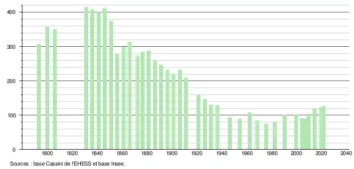 L'évolution du nombre d'habitants est connue à travers les recensements de la population effectués dans la commune depuis 1793. Pour les communes de moins de 10 000 habitants, une enquête de recensement portant sur toute la population est réalisée tous les cinq ans, les populations légales des années intermédiaires étant quant à elles estimées par interpolation ou extrapolation[21]. Pour la commune, le premier recensement exhaustif entrant dans le cadre du nouveau dispositif a été réalisé en 2004[22].