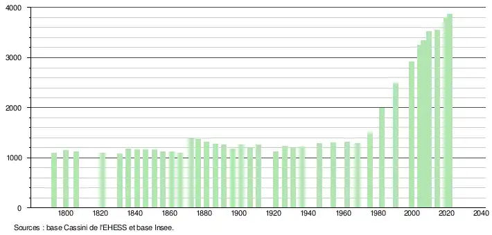 L'évolution du nombre d'habitants est connue à travers les recensements de la population effectués dans la commune depuis 1793. Pour les communes de moins de 10 000 habitants, une enquête de recensement portant sur toute la population est réalisée tous les cinq ans, les populations légales des années intermédiaires étant quant à elles estimées par interpolation ou extrapolation[25]. Pour la commune, le premier recensement exhaustif entrant dans le cadre du nouveau dispositif a été réalisé en 2004[26].