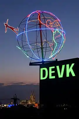 Le [6] l'œuvre a été transportée par hélicoptère depuis le Severinsbrücke jusqu'à son emplacement actuel, sur le toit du bâtiment du siège de la compagnie d'assurances mutuelle DEVK (de), sur la rive gauche du Rhin, à proximité du Zoobrücke (de).