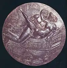 Le poète Ennius (vers -239/169) déclare « qu'exposer son corps nu parmi les citoyens est le début de la disgrâce publique » (flagitium), un sentiment partagé par Cicéron qui lie l'auto-confinement du corps avec la citoyenneté[99],[100],[younger 1],[101]. Originellement, flagitium désigne une humiliation publique puis plus tard plus généralement une disgrâce[102]. L'attitude des Romains envers la nudité diffère de celle des Grecs dont l'idéal masculin s'exprimait par la nudité masculine dans l'art et lors d'évènements réels comme les évènements sportifs. Même lorsqu'ils se déshabillent pour des exercices physiques, les Romains gardent leur sexe et leurs fesses couvertes, une coutume italique partagée aussi avec les Étrusques, dont l'art les montre la plupart du temps portant pagne ou un vêtement court[103]. Les Romains qui participaient aux Jeux olympiques antiques suivaient sans doute la coutume grecque de nudité, mais la nudité athlétique à Rome a été datée diversement, peut-être dès l'introduction de jeux grecs au IIe siècle av. J.-C., mais peut-être irrégulièrement jusqu'à l'époque de Néron vers l'an 60[104].