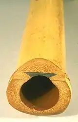 Le shakuhachi est habituellement taillé dans une tige de bambou madaké (Phyllostachys reticulata). Les shakuhachi de taille moyenne (proche des 1,8 shaku) possèdent en général 7 nœuds, les grands instruments en comptent parfois plus.