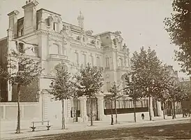L'architecte Ernest Janty conçoit, dès l'origine, deux bâtiments, l'un donnant sur l'avenue d'Iéna, se développant alors sur trois niveaux dont un sous combles mansardés, et un second en contrebas, donnant sur la rue Fresnel, axé autour d'une cour centrale et accueillant alors la vaste bibliothèque du prince, ainsi que les communs, le tout dans un style éclectique très surchargé rappelant le Second Empire.