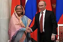 Sheikh Hasina (bengali : শেখ হাসিনা), née le , également connue sous son nom de mariée Sheikh Hasina Wazed (bengali : শেখ হাসিনা ওয়াজেদ), est une femme politique bangladaise qui occupe le poste de Première ministre du Bangladesh depuis . Ayant précédemment occupé le poste pendant cinq ans, elle est la Première ministre ayant occupé le poste le plus longtemps dans l'histoire du Bangladesh.