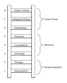 La vision d'Arnstein du contrôle citoyen n'offre pas de méthodologie claire pour choisir qui participe et comment la participation citoyenne est menée[11], mais elle a ouvert la voie à l'élaboration de critères permettant de mieux contrôler la mise en œuvre de partenariats équitables dans lesquels les citoyens ont une influence réelle sur des processus de décision affectant leur vie quotidienne.