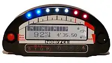 Un afficheur électronique de compétition. Les LED de shift-light sont sur la partie supérieure. Ici bleu-vert-rouge.