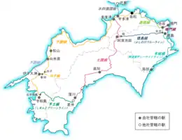 La JR Shikoku possède un réseau de 855,2 km. Contrairement à d'autres compagnies de la Japan Railways, la JR Shikoku a arrêté la classification des "lignes principales" dans l'appellation de ses lignes en 1988. Avant ce changement les lignes Dosan, Kōtoku, Tokushima et Yosan étaient classifiées en ligne principales.