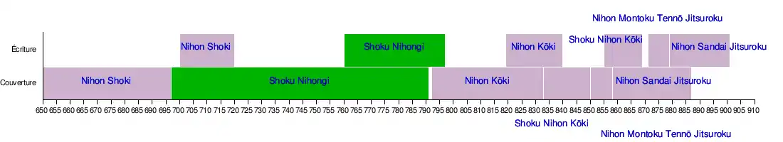 L'ouvrage couvre la période de soixante-quinze ans s'étendant du début du règne de l'empereur Mommu en 697 jusqu'à la dixième année du règne de l'empereur Kōnin en 771[1], couvrant neuf règnes impériaux[2].