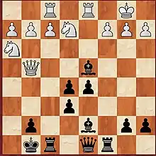 1.e4 c5 2.Cc3 e6 3.d4 cxd4 4.Dxd4 Cc6 5.Da4 Fc5 6.Cb5 Cf6 7.e5 Cxe5 8.Ff4 Cfg4 9.Ch3 f6 10.Fe2 h5 11.Fxg4 hxg4 12.Fxe5 fxe5 13.Dxg4 O-O 14.O-O-O d5 15.Thf1 Fd7 16.Cc3 Tc8 17.Rb1 Fd4 18.Ce2 (voir diagramme)
