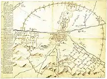 Les sapeurs portugais construisent un pont flottant sur le fleuve Guadiana qui uni deux quartiers portugais à Vado del Moro et permet aux troupes de Mendes de Vasconcelos de traverser le fleuve[18]. Après avoir renforcé Santa Engracia, au nord de San Critsóbal, et fortifié un pont sur la rivière Gévora, ils construisent, sans être inquiétés, un arc de circonvallation de Gévora à Vado del Moro[17]. Le Fort del Mayordomo, situé près du fleuve Guadiana, est abandonné par sa garnison espagnole peu après sa construction[17]. Les Portugais l'utilisent pour couvrir la construction de la ligne de circonvallation vers le Guadiana[17]. Ils tentent également d'occuper le Cerro del Viento, une colline proche de Vado del Moro, mais sont repoussés par la garnison espagnole qui s'y trouve et doivent construire la ligne de circonvallation derrière elle[17]. Compte tenu de l'importance stratégique du Cerro del Viento, la colline voisine du Cerro de las Mayas est désignée pour une fortification en étoile improvisée par le général italien Ventura de Tarragona, mais elle n'est pas construite, laissant le Fort de San Miguel vulnérable[17].