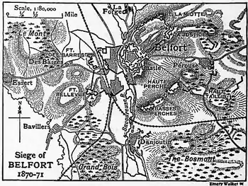 Lorsque les troupes prussiennes, commandées par le général August von Werder et son adjoint le général Udo von Tresckow, investissent les pourtours de la ville le , elles se heurtent à une résistance plus vive que prévu. Au lieu de s'enfermer dans la place, la garnison de 15 000 hommes du colonel Denfert-Rochereau dispute toutes les approches. Tout au long du premier mois, la garnison de Belfort parvient à mener des sorties, appuyées par ses canons à longue portée, obligeant les Allemands à reculer à plusieurs reprises et à abandonner les villages conquis. Inférieurs numériquement et confrontés à un hiver rigoureux, les Allemands doivent mener un siège méthodique de la ville pour la faire tomber.