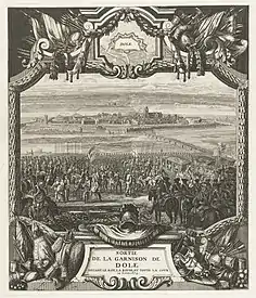Le 7 juin, les 1 200 derniers défenseurs sortent de Dole avec armes, bagages et mèches allumées en défilant avec fierté devant le dauphin, la reine et la cour de France. Louis XIV s'engage à respecter les immunités et privilèges de la ville[4].