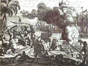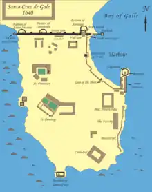 Le siège du fort portugais Santa Cruz de Gale à Galle en 1640, a eu lieu pendant la Guerre néerlando-portugaise et la Guerre luso-singhalaise. Le fort de Galle commandait 282 villages, qui contenaient les terres de cannelle les plus fertiles du sud du Sri Lanka[14]. C'était aussi une importante défense côtière stratégique du Ceylan portugais[15]. Les Néerlandais, qui étaient dans une alliance avec le Royaume de Kandy, débarqua un corps expéditionnaire sous les ordres du commodore Willem Jacobszoon Coster d'Akersloot, dans la baie de Galle, le 8 mars 1640. Après avoir bombardé le fort durant quatre jours consécutifs, les troupes hollandaises ont pris d'assaut le fort et ont remporté une victoire le 13 mars 1640. La garnison portugaise, dirigée par le capitaine Lourenço Ferreira de Brito, a monté une résistance acharnée et des niveaux de pertes étonnamment élevés parmi les troupes hollandaises ont donné lieu au proverbe «Or à Malacca, plomb à Galle»[16], «À Malacca beaucoup d'or, à Galle beaucoup de plomb» «In Malacca much gold, in Galle much lead» [16]. Avec cette victoire, les Néerlandais ont eu accès à un grand port qu'ils ont ensuite utilisé comme port naval commode base pour attaquer Goa et d'autres défenses portugaises en Inde du Sud. Ils ont également eu accès au commerce de la cannelle du Sri Lanka et ont pris pied de manière permanente sur l'île.