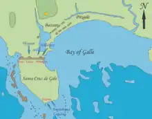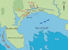 Le fort portugais de Santa Cruz de Gale était situé sur un promontoire à l'extrémité ouest de la baie de Galle. Bien que considérablement élevé à son extrémité sud, il s'est progressivement incliné vers l'isthme où il se connectait au continent. À cet isthme, un mur s'étendait du côté de la mer au côté de la baie entourant la ville de Galle. Il y avait trois bastions défendant le mur de la mer à la baie appelés Santo António, Conception et Santiago. Santiago était petite et avait une terrasse basse ouverte, ce qui la rendait vulnérable aux attaques à la grenade. Du Santiago, un mur de parapet courait le long de la baie jusqu'à la Retraite, une fortification qui contenait le donjon du capitaine et une esplanade, qui avait de la place pour monter 20 canons[58].