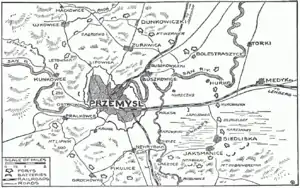 Grâce à l'offensive allemande de la bataille de la Vistule qui retient l'essentiel des réserves russes loin de la ville, une opération de secours est lancée la 3e armée austro-hongroise du général Borojević parvient, le 18 octobre 1914, à rompre l'encerclement et à ravitailler la ville, alors sur la ligne de front austro-russe[8]. Le camp retranché est alors renforcé. Cependant, la retraite allemande sur la Vistule, non coordonnée avec les manœuvres austro-hongroise oblige les commandants de l'armée commune à abandonner les abords de la ville et à se replier à nouveau jusqu'aux Carpates[9]. Przemyśl est de nouveau encerclée à partir du 9 novembre 1914.