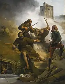 Des civils de Saragosse, dont des moines des monastères locaux s'engagent alors dans des combats de rue. Le Baron Lejeune dans ses mémoires décrit le personnage de « San Yago Saas comme un brillant chef et un prédicateur ardent ... il avait lui-même massacré dix-sept Français »[3]. Cette image est reprise dans le tableau d'Horace Vernet en 1819[4].