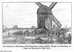 Le 23 mars, Bülow lance une attaque contre la porte de Reims, qui est repoussée. Il envoie un deuxième émissaire qui n'est pas mieux reçu que le précédent. Il fait installer des positions pour ses batteries et se prépare à un siège en règle[143]. La ville est violemment bombardée dans la nuit du 23 et la journée du 24 mais une sortie de l'artillerie à cheval polonaise permet de détruire une partie des tranchées creusées par les assiégeants. Le 25 mars, les habitants constituent une unité de sapeurs volontaires pour aider ceux de l'armée[144].