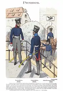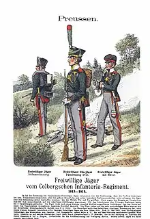 Chasseurs volontaires du régiment de Colberg, unité du 3e corps de Bülow engagée au siège de Soissons. Dessin de Richard Knötel, 1890.