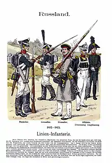 Infanterie russe vers 1812-1813. Dessin de Richard Knötel, 1890.