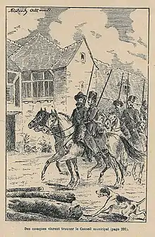« Des cosaques vinrent trouver le conseil municipal », gravure de l'ouvrage Les Cosaques en Champagne et en Brie : Récits de l'invasion de 1814 par Louis Rogeron et Robert Allouard, 1905.