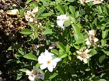 Ses fleurs délicates sont blanc crème à blanc rosé avec le cœur plus soutenu. Semi-doubles, elles possèdent 17 à 25 pétales[4] ; elles sont très petites (1 à 3 cm) et complètes, en forme de coupe. Leur floraison est remontante. Sa zone de rusticité est de 6b à 9b.