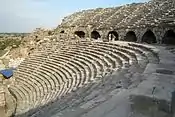 À l'ouest, jouxtant l'agora, se dressent les éléments encore bien conservés d'un théâtre, entouré d'arcades massives, qui remonte sans doute au milieu du IIe siècle. Ce théâtre, conçu tout spécialement pour les jeux du cirque, avait tout autour de l'orchestra (la piste), un mur de 2,5 m afin de protéger les spectateurs. Il subit une curieuse transformation au Ve ou VIe siècle puisqu'il fut transformé en église. Au sud-est du théâtre existait un marché rectangulaire (88,50 × 69,20 m) entouré, sur 7 m de profondeur, d'une colonnade ionique. À l'est de ce marché, à proximité des remparts, s'élève une petite basilique datant de l'époque byzantine et un baptistère (Ve – VIe siècle).