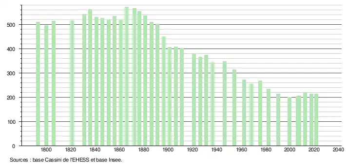 L'évolution du nombre d'habitants est connue à travers les recensements de la population effectués dans la commune depuis 1793. Pour les communes de moins de 10 000 habitants, une enquête de recensement portant sur toute la population est réalisée tous les cinq ans, les populations légales des années intermédiaires étant quant à elles estimées par interpolation ou extrapolation[18]. Pour la commune, le premier recensement exhaustif entrant dans le cadre du nouveau dispositif a été réalisé en 2007[19].