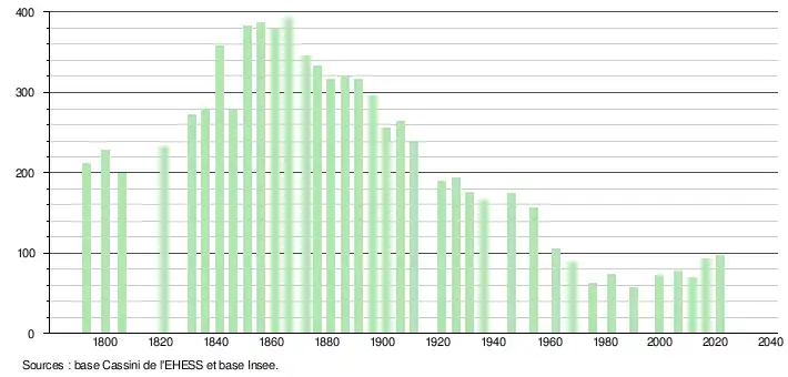 L'évolution du nombre d'habitants est connue à travers les recensements de la population effectués dans la commune depuis 1793. Pour les communes de moins de 10 000 habitants, une enquête de recensement portant sur toute la population est réalisée tous les cinq ans, les populations légales des années intermédiaires étant quant à elles estimées par interpolation ou extrapolation[42]. Pour la commune, le premier recensement exhaustif entrant dans le cadre du nouveau dispositif a été réalisé en 2006[43].