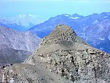 Vue du sommet du signal du Grand Mont-Cenis depuis la pointe de Ronce à l'est ; au loin, les Grandes Rousses à gauche et les aiguilles de Péclet et de Polset à droite.