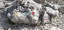 - Marquage peint : c'est le marquage le plus courant. Il peut être peint sur des supports naturels (arbres, rochers) ou artificiels (poteaux électriques ou directionnels, murs et constructions diverses).