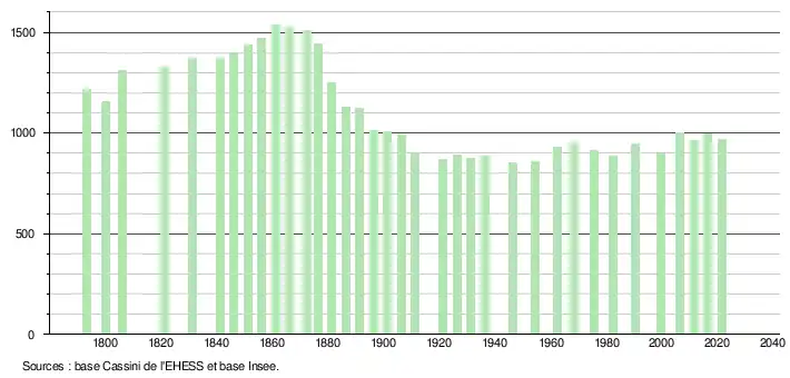 L'évolution du nombre d'habitants est connue à travers les recensements de la population effectués dans la commune depuis 1793. Pour les communes de moins de 10 000 habitants, une enquête de recensement portant sur toute la population est réalisée tous les cinq ans, les populations légales des années intermédiaires étant quant à elles estimées par interpolation ou extrapolation[33]. Pour la commune, le premier recensement exhaustif entrant dans le cadre du nouveau dispositif a été réalisé en 2006[34].