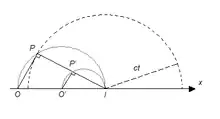Tout en laissant fixe, faisons varier , ce qui revient à faire varier c=g/, et donc le rayon ct du cercle en pointillés longs. On voit ainsi que, pour chaque point P du demi-cercle de diamètre OI, on peut trouver une valeur de telle que P soit à l'intersection du demi-cercle de rayon ct et du demi-cercle de diamètre OI. Donc, au temps , il passe une onde stationnaire par rapport au bateau en chaque point du demi-cercle de diamètre OI.
