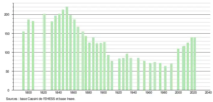 L'évolution du nombre d'habitants est connue à travers les recensements de la population effectués dans la commune depuis 1793. Pour les communes de moins de 10 000 habitants, une enquête de recensement portant sur toute la population est réalisée tous les cinq ans, les populations légales des années intermédiaires étant quant à elles estimées par interpolation ou extrapolation[17]. Pour la commune, le premier recensement exhaustif entrant dans le cadre du nouveau dispositif a été réalisé en 2007[18].