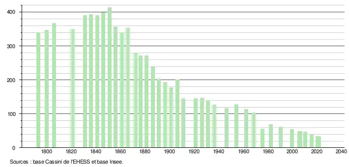 L'évolution du nombre d'habitants est connue à travers les recensements de la population effectués dans la commune depuis 1793. Pour les communes de moins de 10 000 habitants, une enquête de recensement portant sur toute la population est réalisée tous les cinq ans, les populations légales des années intermédiaires étant quant à elles estimées par interpolation ou extrapolation[23]. Pour la commune, le premier recensement exhaustif entrant dans le cadre du nouveau dispositif a été réalisé en 2005[24].