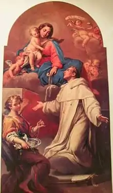 | Attributs | phylactère "Ave Maria"; habit blanc avec croix rouge et bleu des religieux trinitaires |