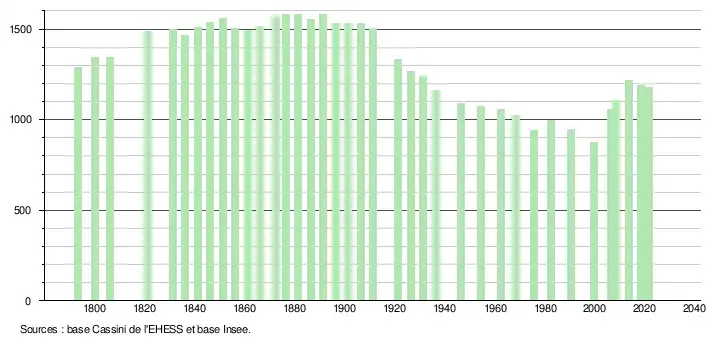 L'évolution du nombre d'habitants est connue à travers les recensements de la population effectués dans la commune depuis 1793. Pour les communes de moins de 10 000 habitants, une enquête de recensement portant sur toute la population est réalisée tous les cinq ans, les populations légales des années intermédiaires étant quant à elles estimées par interpolation ou extrapolation[16]. Pour la commune, le premier recensement exhaustif entrant dans le cadre du nouveau dispositif a été réalisé en 2008[17].