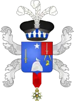 D'azur à un oiseau posé sur un mont isolé et surmonté d'une étoile, le tout d'argent et accompagné, à senestre d'un compas ouvert, à dextre d'une épée haute en pal, et en pointe d'un casque taré de profil, le tout d'or ; au franc-quartier des barons militaires brochant au neuvième de l'écu. |