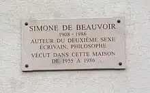 Simone de Beauvoir (/simɔn də bovwaʁ/[1] ), née le dans le 6e arrondissement de Paris, ville où elle est morte le , est une philosophe, romancière, mémorialiste et essayiste française.