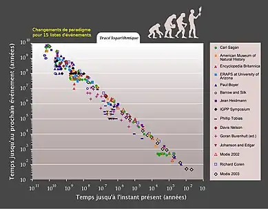 L'idée de présenter l'évolution exponentielle de la technologie remonte au moins à 1932, avec John B. Sparks et son « histocarte de l’évolution ». Vers la même époque, cette idée a été critiquée par le cybernéticien Heinz von Foerster (secrétaire des conférences Macy auxquelles a participé John von Neumann, entre autres)[10], en soutenant que les souvenirs s'estompent naturellement d'une manière exponentielle.