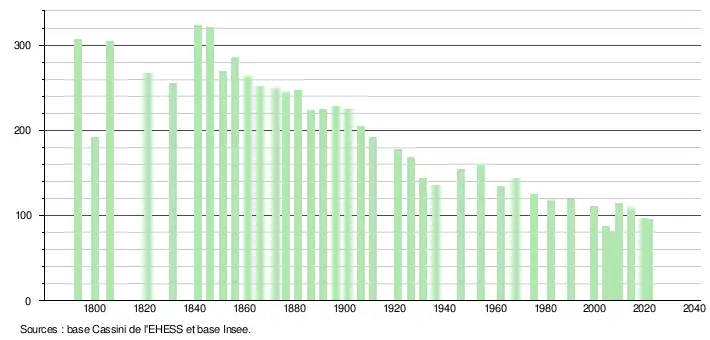 L'évolution du nombre d'habitants est connue à travers les recensements de la population effectués dans la commune depuis 1793. Pour les communes de moins de 10 000 habitants, une enquête de recensement portant sur toute la population est réalisée tous les cinq ans, les populations légales des années intermédiaires étant quant à elles estimées par interpolation ou extrapolation[26]. Pour la commune, le premier recensement exhaustif entrant dans le cadre du nouveau dispositif a été réalisé en 2004[27].