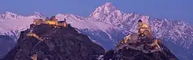 La basilique (mineure) ou château de Valère (ancienne résidence des chanoines du chapitre) et le château de Tourbillon surplombent la ville.