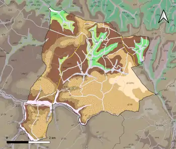 L'occupation des sols de la commune, telle qu'elle ressort de la base de données européenne d’occupation biophysique des sols Corine Land Cover (CLC), est marquée par l'importance des forêts et milieux semi-naturels (70,4 % en 2018), une proportion sensiblement équivalente à celle de 1990 (69,1 %). La répartition détaillée en 2018 est la suivante : forêts (63,4 %), zones agricoles hétérogènes (23,4 %), milieux à végétation arbustive et/ou herbacée (7 %), prairies (5,8 %), terres arables (0,4 %)[33]. L'évolution de l’occupation des sols de la commune et de ses infrastructures peut être observée sur les différentes représentations cartographiques du territoire : la carte de Cassini (XVIIIe siècle), la carte d'état-major (1820-1866) et les cartes ou photos aériennes de l'IGN pour la période actuelle (1950 à aujourd'hui)[Carte 3].