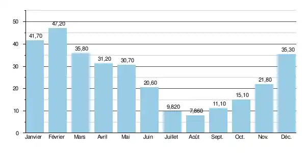 La rivière présente des fluctuations saisonnières de débit, avec des crues hivernales de 30,7 à 47,2 m3/s de décembre à avril-mai inclus, et des maigres de fin d'été-début d'automne, de juillet à octobre (baisse du débit moyen mensuel jusqu'à 7,86 m3/s au mois d'août, variations sur de courtes périodes encore plus importantes).